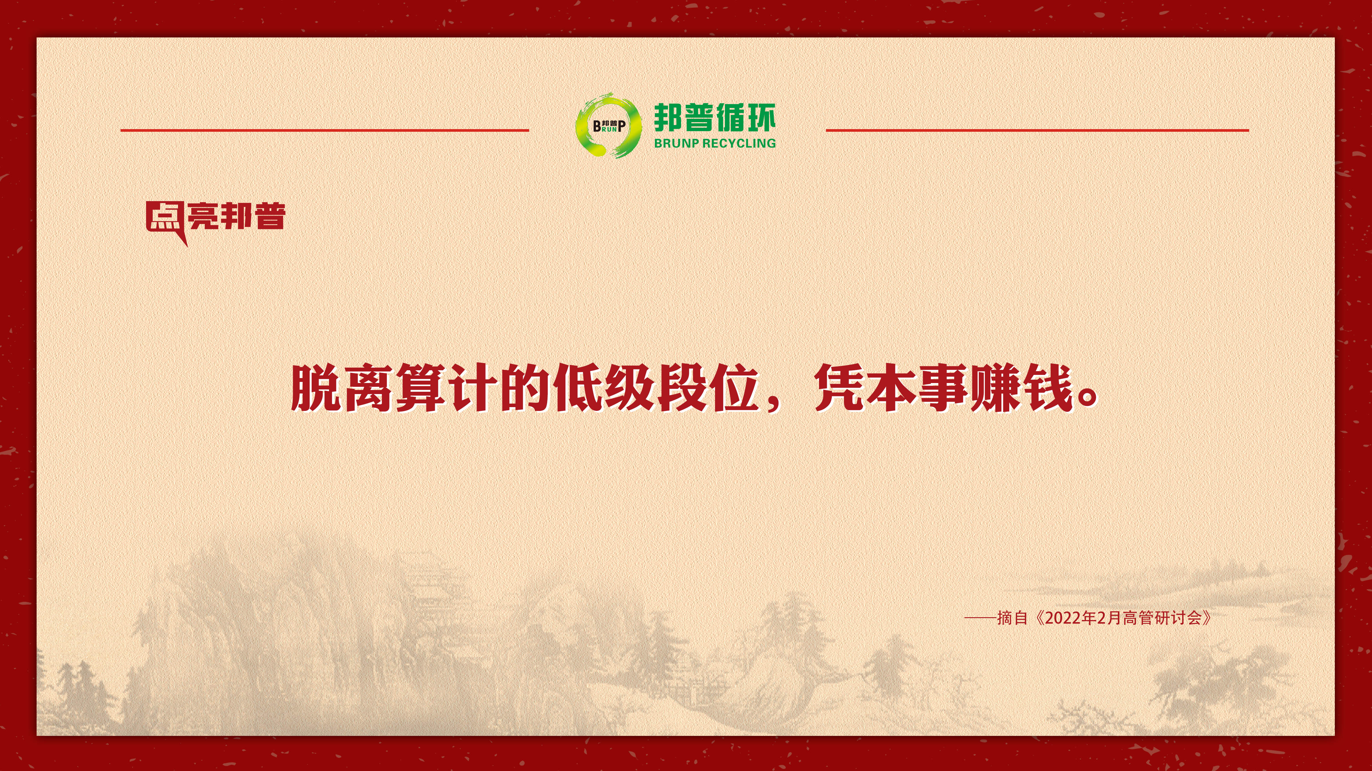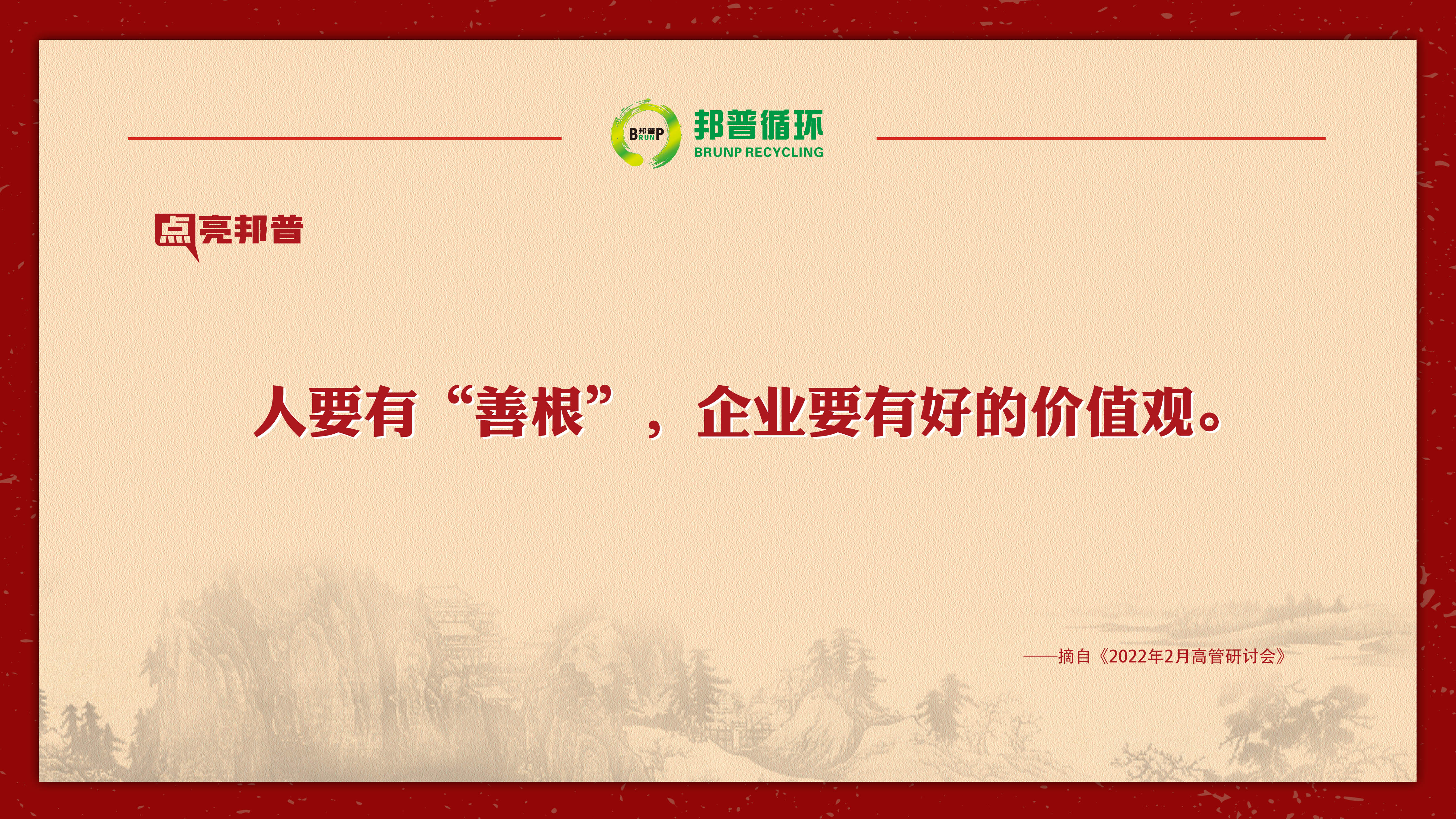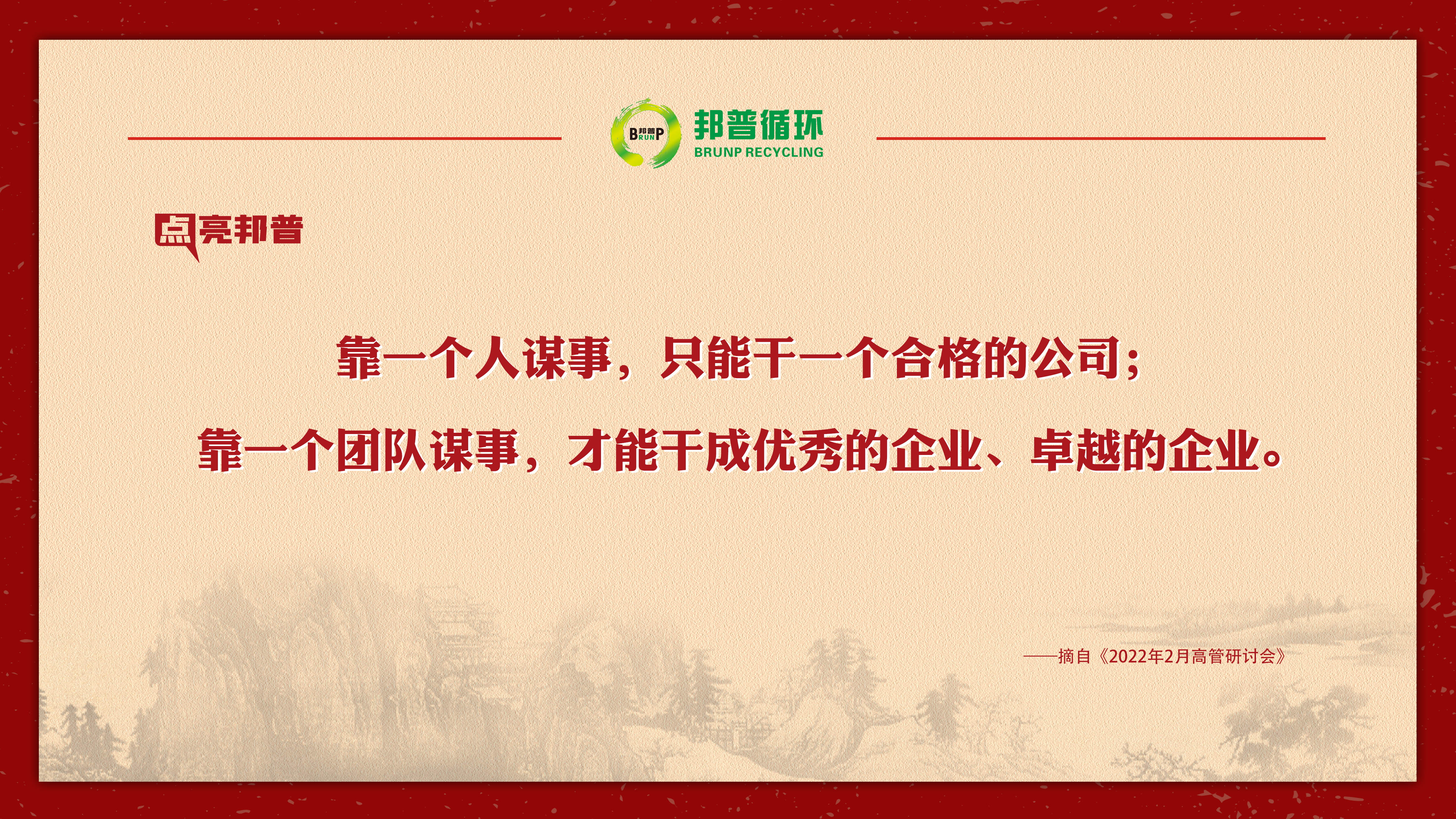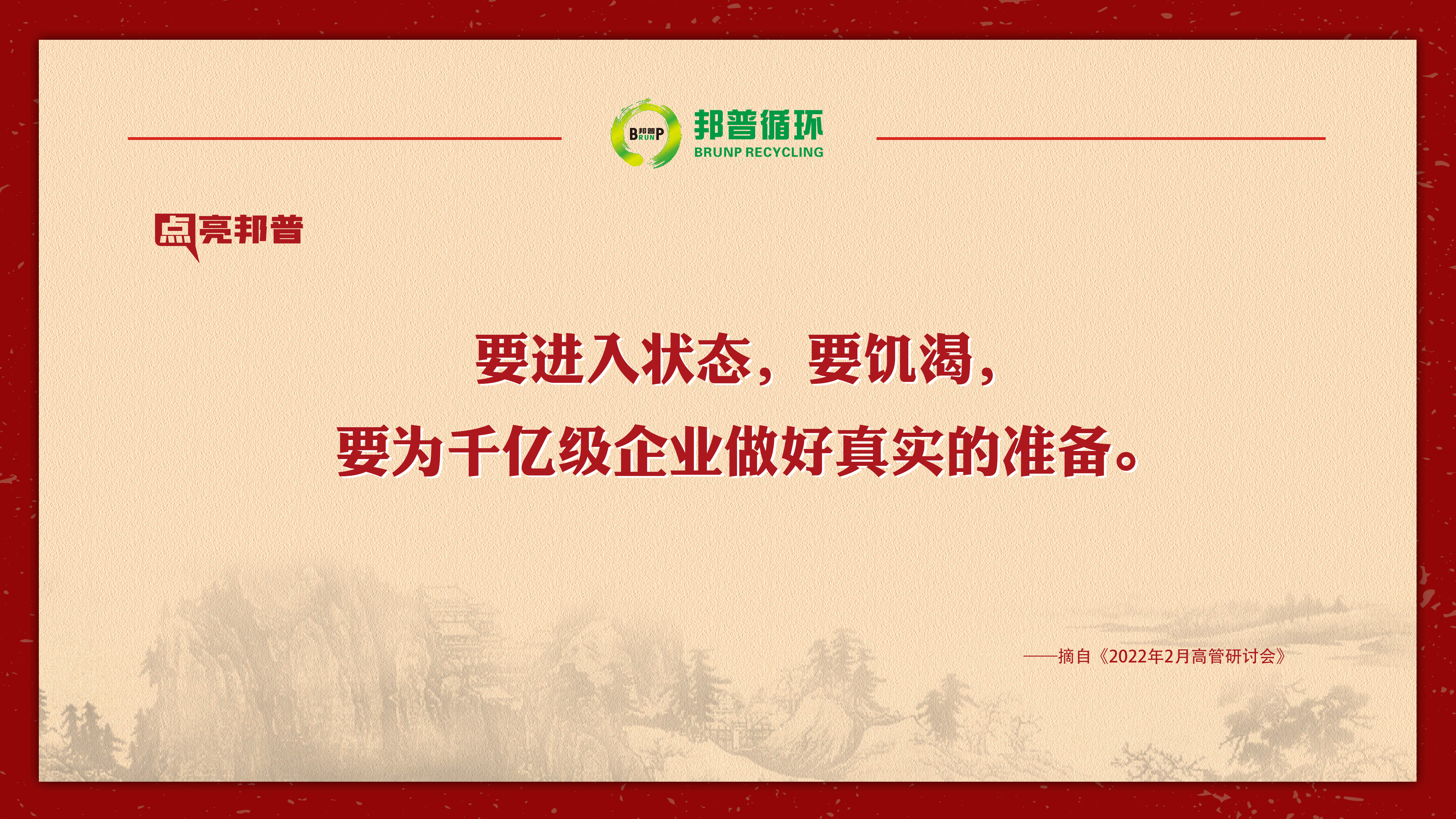 2022年2月,邦普循环高管研讨会上,李长东总裁与高管一起分享优秀企业的价值观,旗帜鲜明地提出大企业一定要为社会做贡献,我们所有人都要调整成这样的状态,为千亿级企业做好真实的准备!本期点亮邦普,和您一同品味。